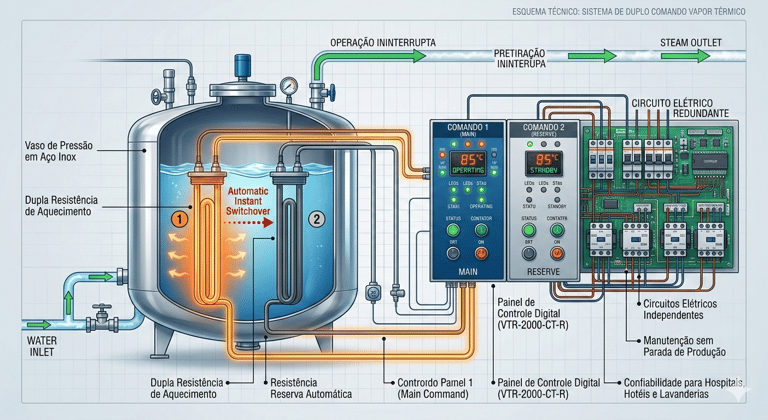 O maior diferencial da Caldeira Elétrica Vapor Térmico é o seu exclusivo sistema de aquecimento com dupla resistência e duplo comando, projetado especificamente para setores que não podem interromper sua operação, como lavanderias industriais, hospitais e hotéis.